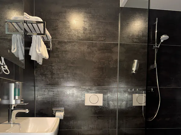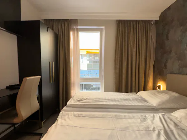 This stylish premium twin or double room combines modern comfort with elegant design. It features air conditioning, a private bathroom with a shower, hairdryer, and complimentary toiletries, as well as soundproof walls and a private entrance. A flat-screen TV and a spacious wardrobe add to your comfort. The view of the street and the Opera Hotel opposite lends the room an exclusive, urban flair.