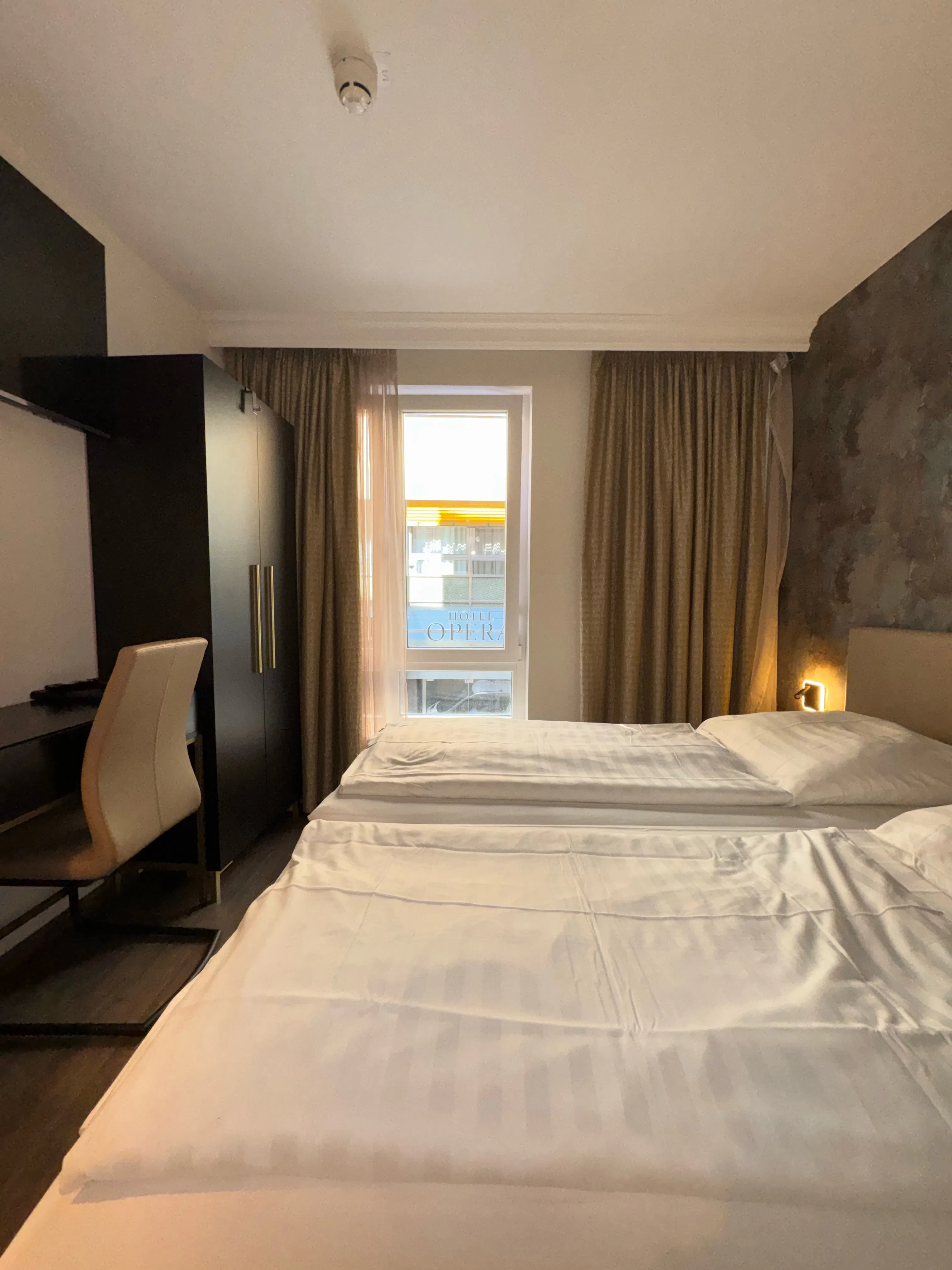 This stylish premium twin or double room combines modern comfort with elegant design. It features air conditioning, a private bathroom with a shower, hairdryer, and complimentary toiletries, as well as soundproof walls and a private entrance. A flat-screen TV and a spacious wardrobe add to your comfort. The view of the street and the Opera Hotel opposite lends the room an exclusive, urban flair.